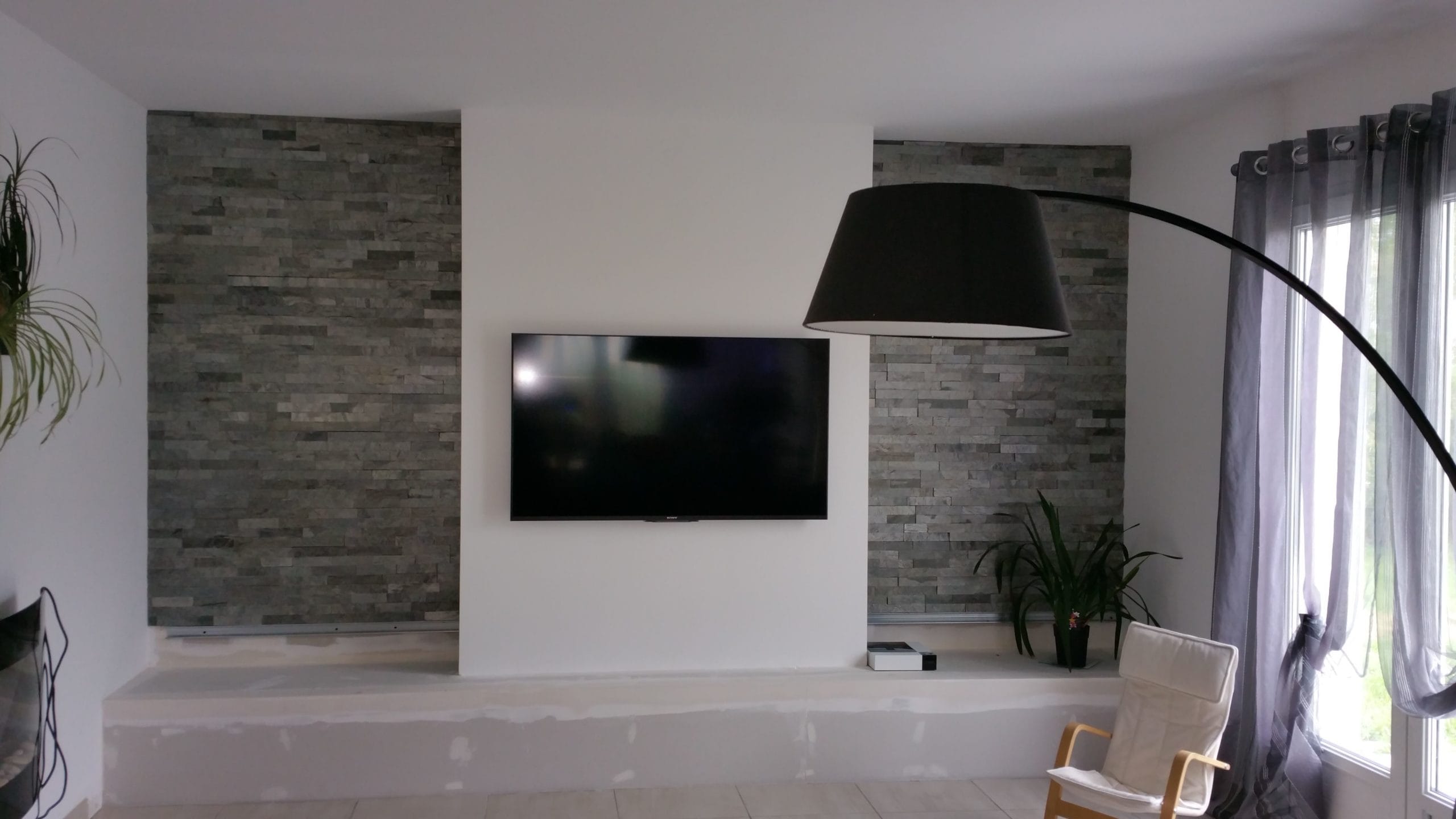 Briques de parement, imitation béton banché, pierre reconstituée. Murs d’accent en salon, chambre, entrée et contour de cheminée.