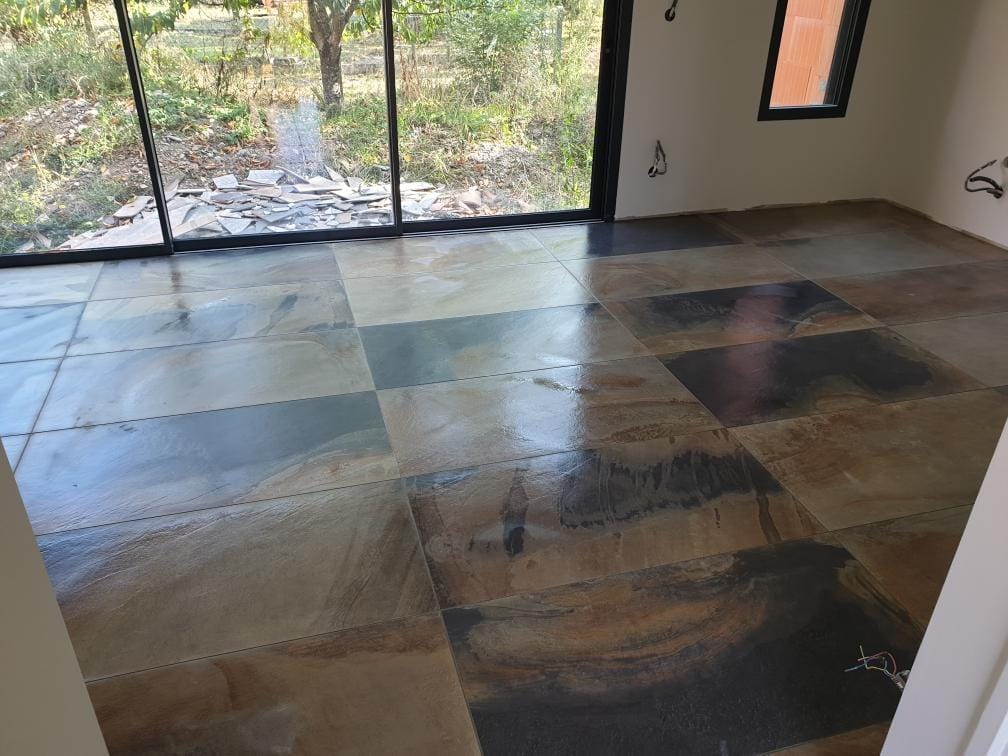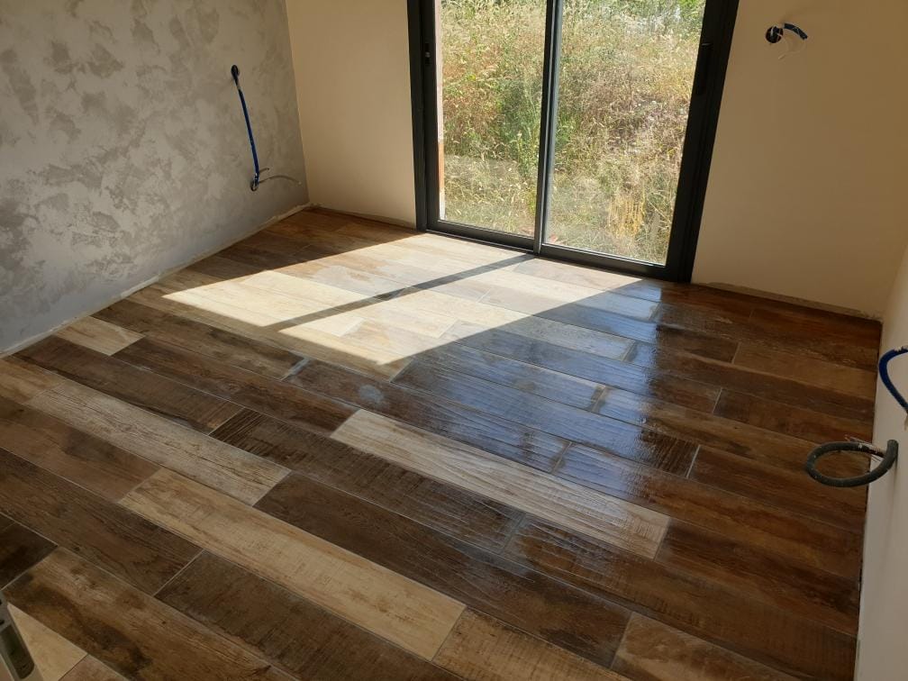 Grès cérame, carrelage grand format, imitation bois, imitation pierre. Pose en pièce de vie, cuisine, entrée, terrasse et garage.